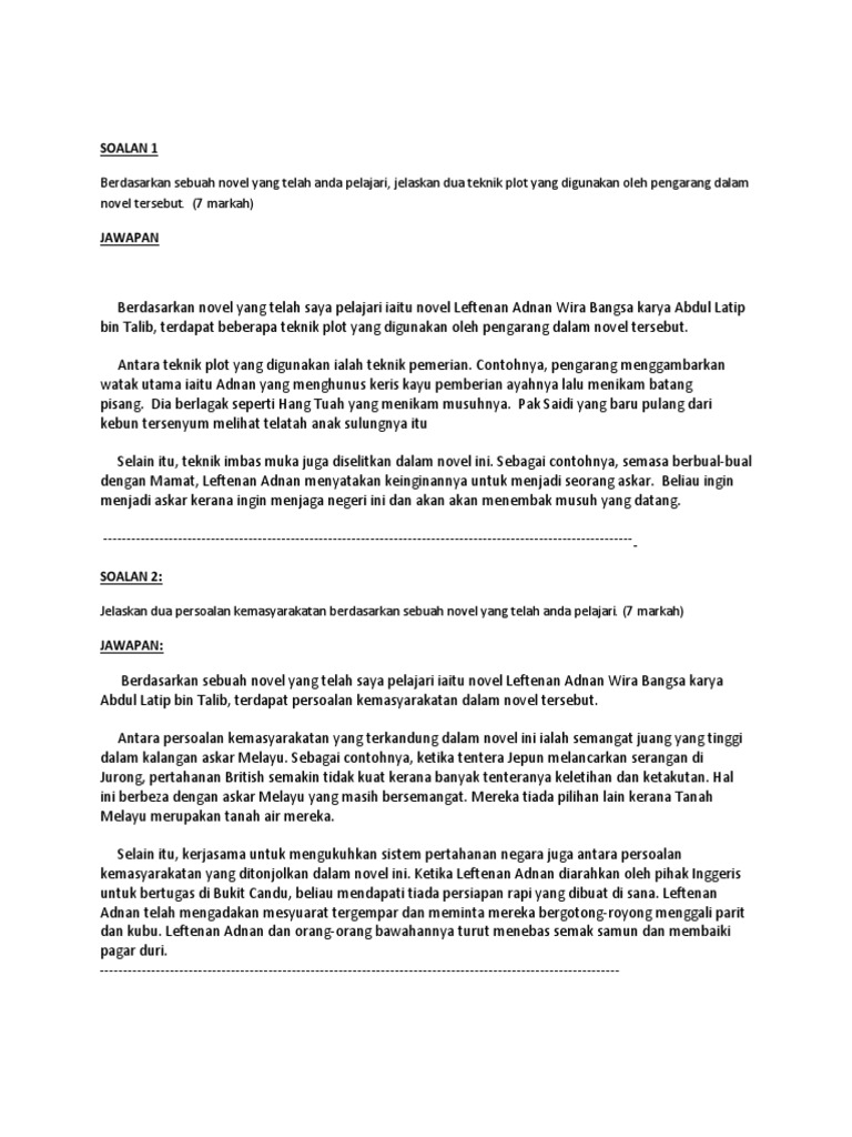Di warung Pak Samad - Pak Saidi menyampaikan kandungan tulisan Syed Syeikh al-Hadi dalam risalah terbaharu kepada pelanggan. Berdasarkan novel Leftenan Adnan karya Abdul Latip bin Talib latar masyarakat pertama ialah masyarakat kampung yang miskin dan bekerja sendiri 1. Contoh Soalan Novel Jawab soalan-soalan di bawah ini berdasarkan novel- novel yang berikut.